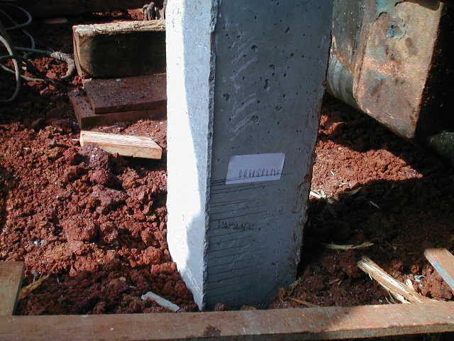 | - Tirando a "nega" em uma estaca pré-moldada. Abaixo, detalhe da medição da nega. | ||