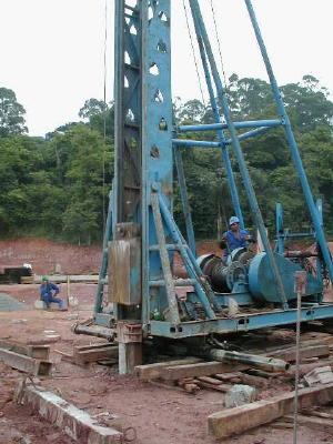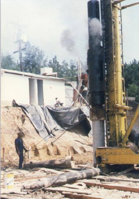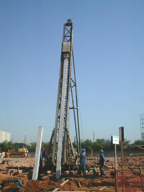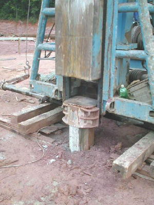 | - Cravação de uma estaca pré-moldada. - Detalhe do capacete e martelo. | ||