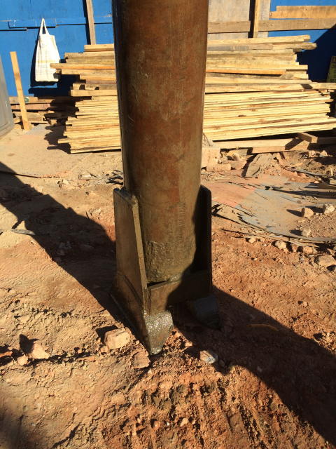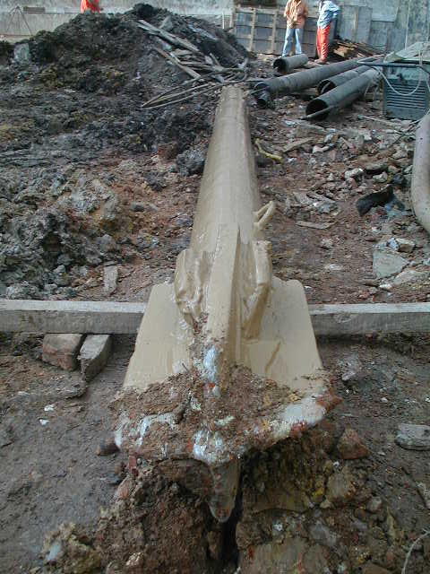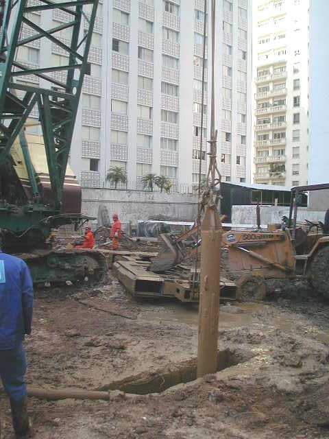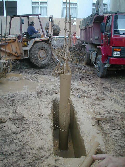 | - Equipamento: Trata-se da colocação de um "trepano" (peso em forma de estaca com ponta cortante), que será utilizada para quebra de uma camada de solo resistente ou matacão ou fragmentos de rocha que impeçam a continuidade da escavação. É acoplada ao guindaste pelos cabos de aço. | ||