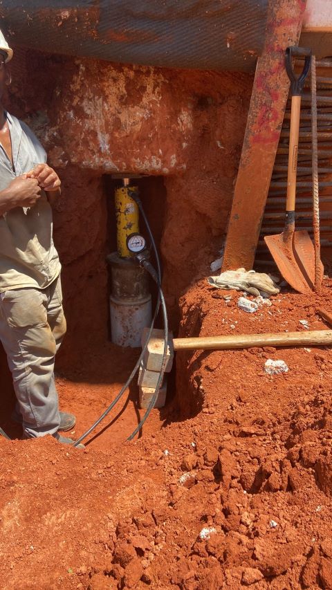 - Introdução do macaco hidraulico sob a base do tubulão existente (neste caso um tubulão vizinho de divisa) |