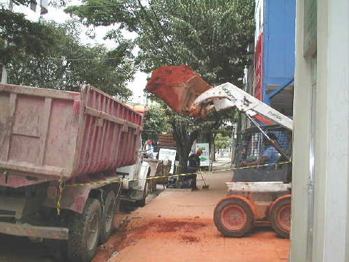 | - Remoção do talude sob laje, com auxilio da "bob-cat", utilizando o passeio público. |