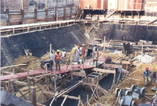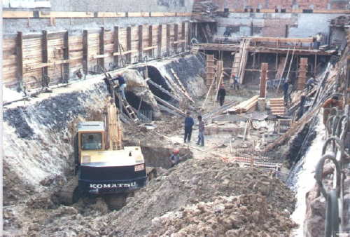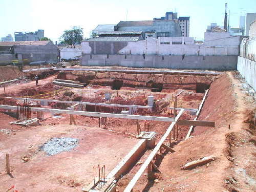 Métodos tradicionais de escavação e prancheamento Podemos observar nas metodologias tradicionais, que os volumes dos taludes a serem removidos após o travamento das lajes dos sub-solos são consideráveis. A remoção desta terra é feita através de corte manual, e transporte via "bob-cat" até os caminhões, estacionados em geral em frente a obra. Em regiões denominadas "quadrilátero" (SP-Capital), a remoção dos taludes torna-se mais onerosa e demorada. Via de regra, ocorrem muitas interferencias neste serviço com o andamento da obra, pois a entrada de materias, concretagens, etc... está sempre sendo utilizada para remoção da terra dos taludes. Veja abaixo algumas fotos do processo: