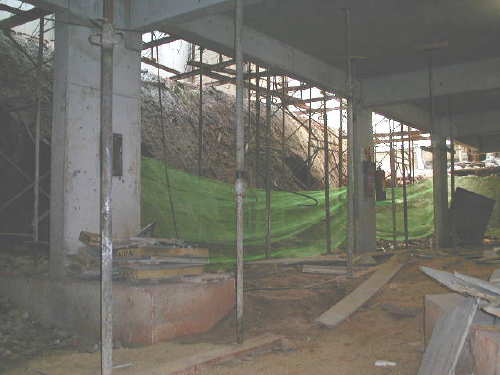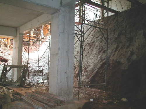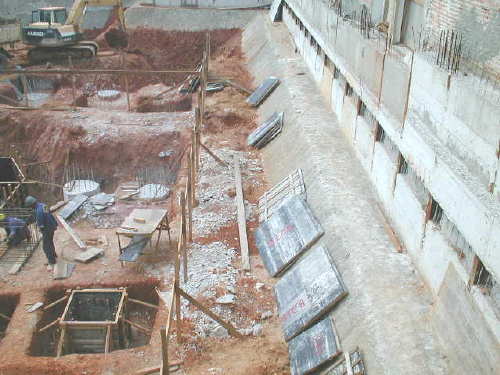 | - Talude do 2o.SS chapiscado, e trecho cortina convencional. Remoção do talude sob laje. |