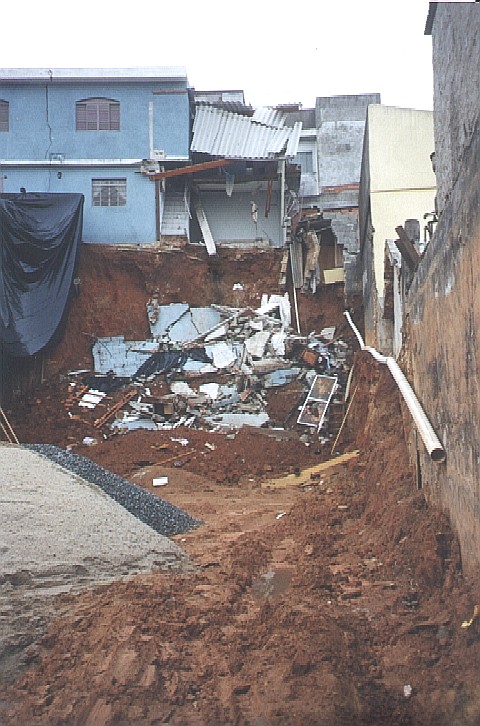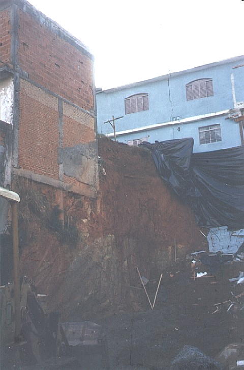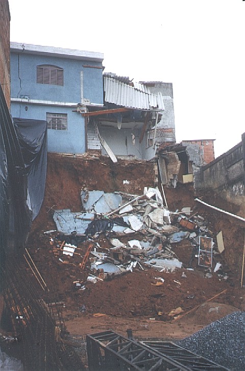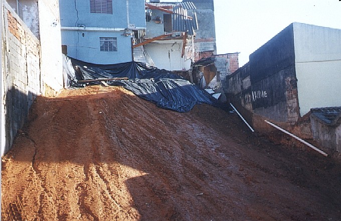 Histórico: Sem o auxílio de um consultor de solos, o proprietário escavou seu terreno para a construção de um comercial. Escavou o terreno nivelando com a Rua, de forma a construir um muro de arrimo de 9.00m de altura nos fundos. O sobrado dos fundos ruiu para dentro da obra. A casa vizinha esquerda ficou no "ar". Devido ao risco de colapso de outras construções vizinhas, procedemos com o aterro da obra. |