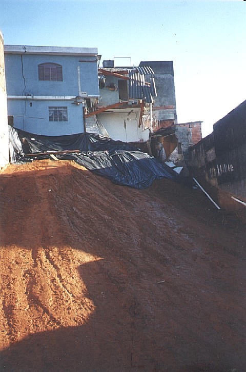 | - Foto em 26/02/99 - Aterro evitando que o desbarrancamento prossiga para outras casas dos fundos. | |