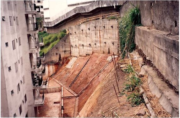 | - Foto em 10/1983 - Eexecução do sitema de contenções entre os dois condomínios - Cortina Atirantada e Taludes | |