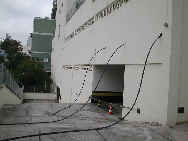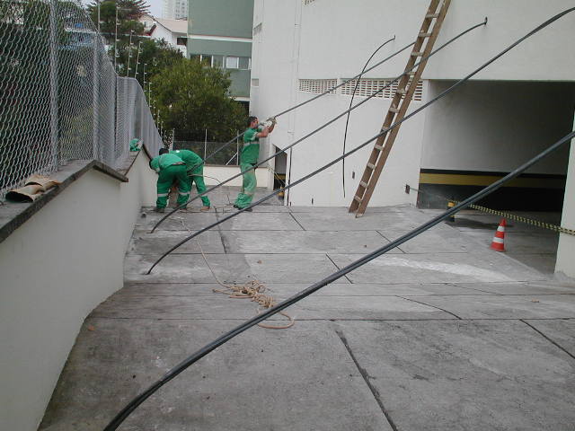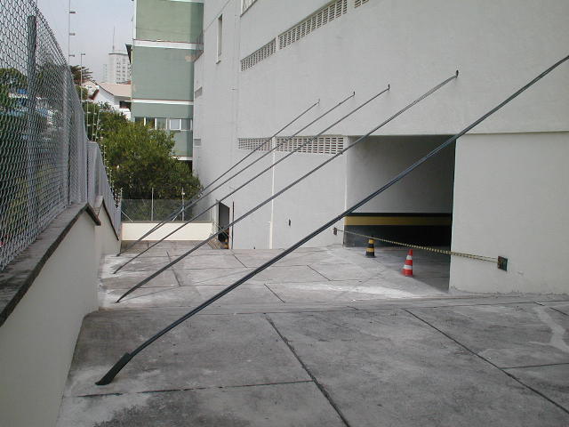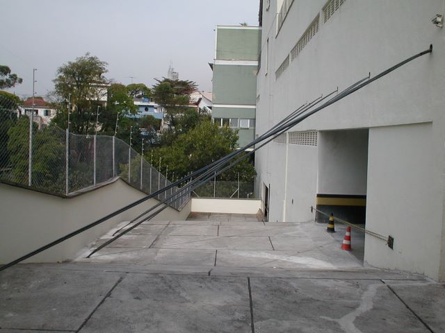 | - Foto em 17/09/2009 -Inicio do atirantamento da rampa nos pilares da estrutura do edifício. Posicionamento dos cabos. | |
