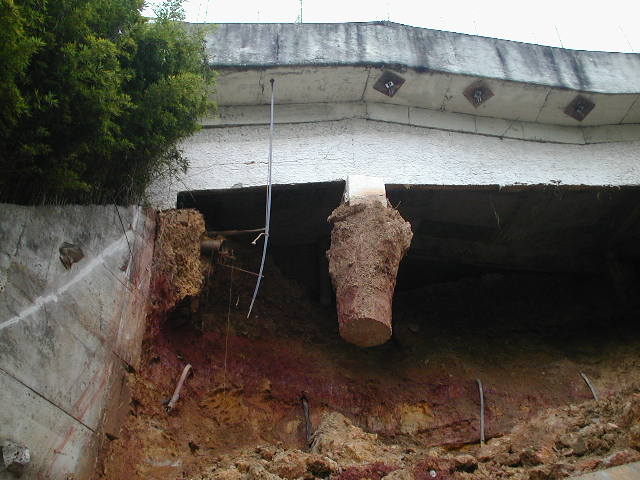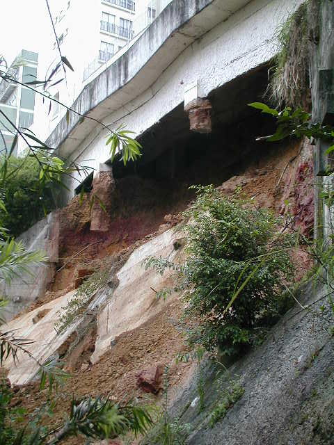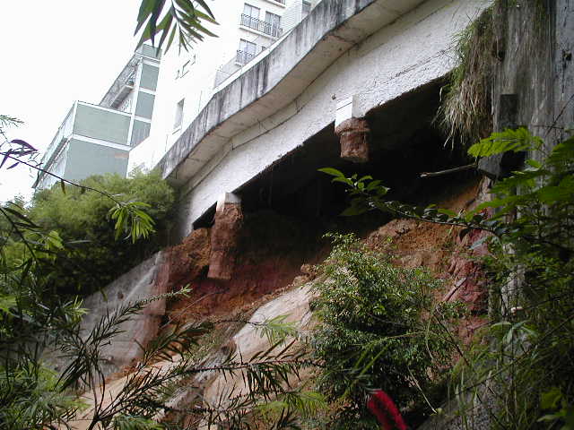 Histórico: Cortina atirantada e talude que serpara a divisa de dois condomínios em um bairro residencial de SP, executados no ano de 1983, entram em colapso devido às fortes chuvas que ocorreram nesta temporada de setembro de 2009. O desnível entre os condomínios contido por esta cortina e o talude são da ordem de 20.00m. O colapso da cortina e do talude atingiram a torre do condomínio situado na parte de inferior, deixando o condomínio da parte de superior com a rampa de acesso aos subsolos flutuando no ar, pois as fundações dos pilares desta rampa foram extirpadas durante o desbarrancamento. O colapso das contenções também ameaçava inclusive as fundações da torre do condomínio situado na parte superior. Os veículos dos proprietários dos imóveis do condomínio superior ficaram presos nos subsolos, uma vez que a única saída seria atravessar por rampa flutuante. Felizmente não ocorreram vítimas. A SOLO.NET foi contratada solucionar inicialmente a remoção dos veículos e instruir medidas de segurança para os dois condomínios, além de desenvolver um projeto de estabilidade para as contenções que colapsaram. A possibilidade de somente remover estes veículos após a realização das obras de estabilidade das contenções e da execução da fundação da rampa descalçada, causou um grande desconforto aos moradores. Adotamos neste caso uma solução inédita e inusitada, de maneira a permitir a remoção dos veículos presos nos subsolos em tempo recorde, promovendo um atirantamento provisório da rampa, ancorada na viga de borda do sobresolo garagem, possibilitando assim a retirada com segurança de todos os veículos. Esta solução foi elaborada e executada em 6 dias, com sucesso total na retirada dos veículos dos dois subsolos do condomínio superior. Abaixo apresentamos as sequencias de execução desta solução de "RAMPA ATIRANTADA" : |