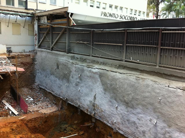 Histórico: O projeto de contenção para esta cortina em solo grampeado, foi projetada em um solo mole, e com grampos considerados curtos. A SOLO.NET foi chamada pelo cliente que estava construindo a obra, ao notar as deformações elevadas que ocorriam no muro. Ao chegarmos a obra e definirmos as medidas de estabilização, através de um aterro emergencial, presenciamos o colapso deste muro. Prosseguiu-se o reaterro junto ao trecho acidentado, sobre o muro que havia caido, para evitar que o vizinho fosse prejudicado. Adotou-se então a solução em cortinas com placas duplas pré-moldadas para recuperação da cortina, e prosseguimento da obra. |