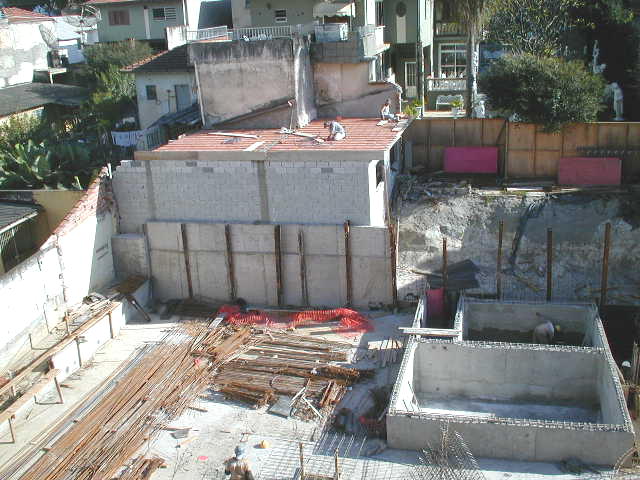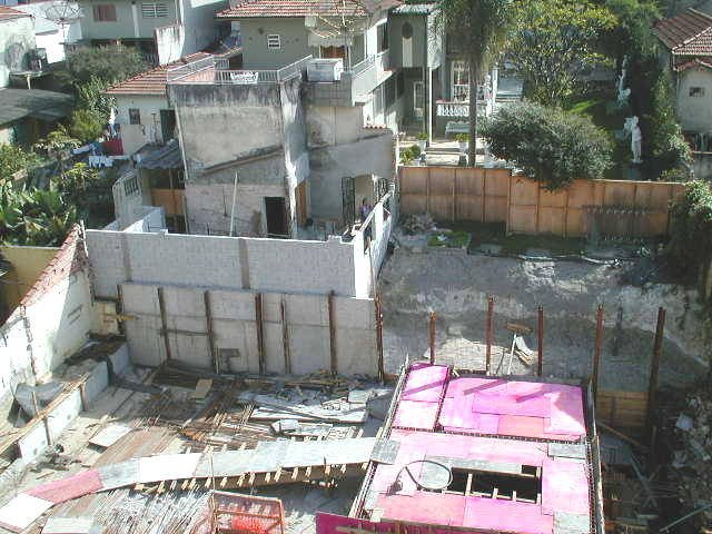 | - Foto em 01/07/03 - Preparando mais um trecho de laje para travar a cortina dos fundos. Vizinho inicia reconstrução da edícula. | |
