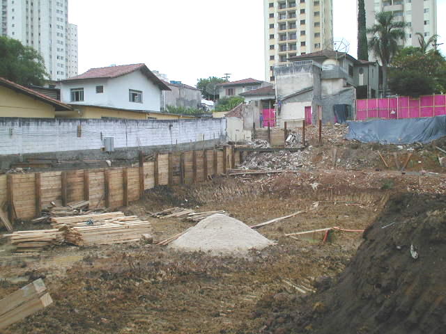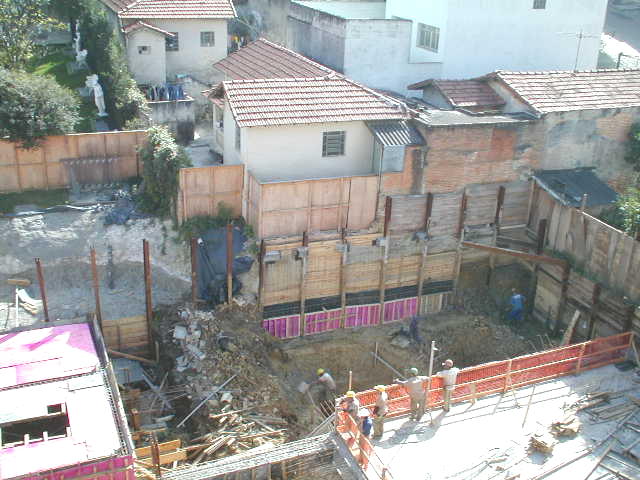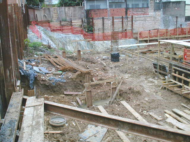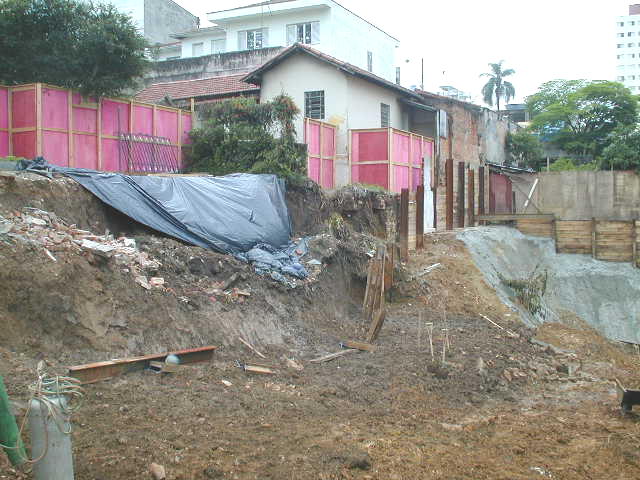 Histórico: Nesta obra, o projetista não considerou que o balanço dimensionado para os perfis metálicos era excessivo, levando-se em conta o solo de baixa resistencia, e nível d´agua elevado. Os perfis metálicos já prancheados, entraram em colapso, levando as construções vizinhas dos fundos para dentro da obra. Na sequencia abaixo, seguem-se os serviços para recuperação do acidente. |