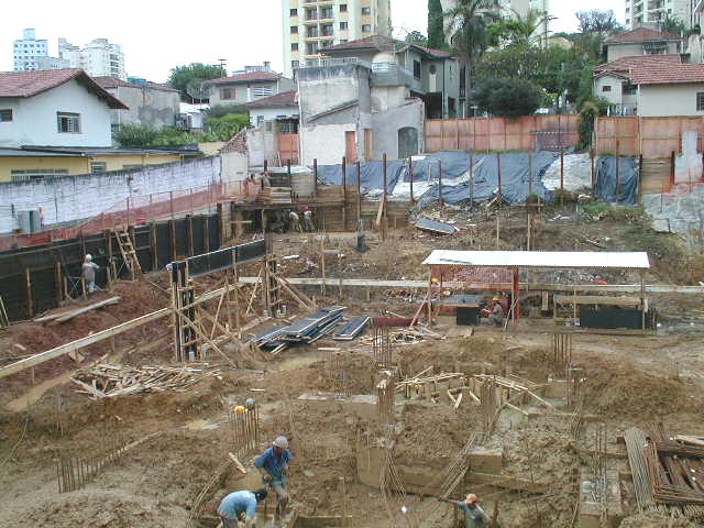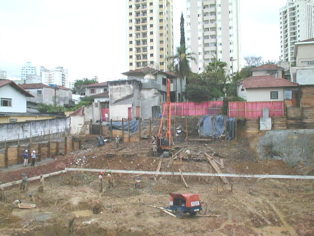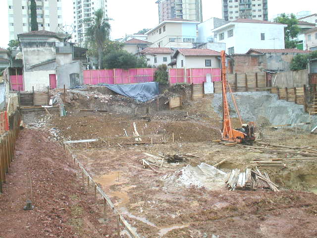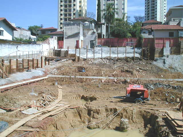 | - Foto em 14/02/03 - Escavação de blocos e quebra de cabeça de estacas (Franki), corpo do prédio. | |