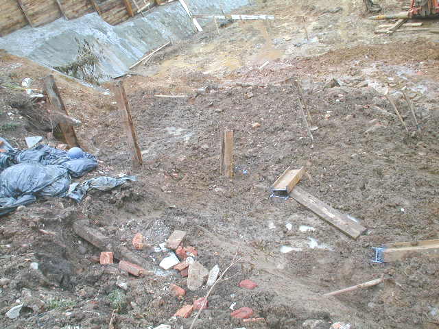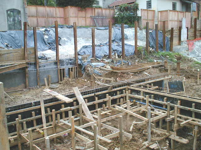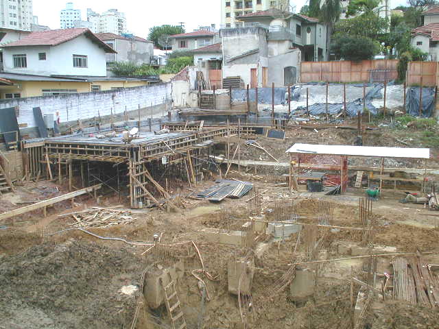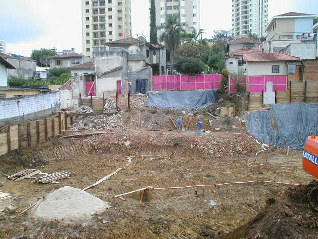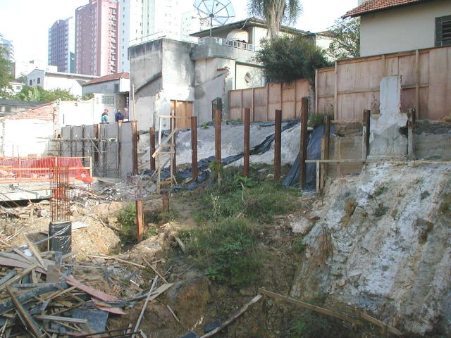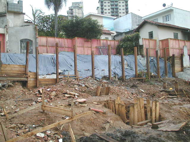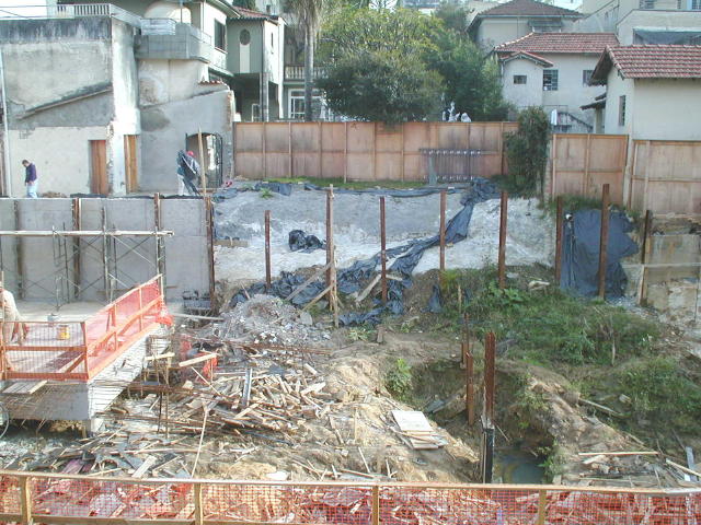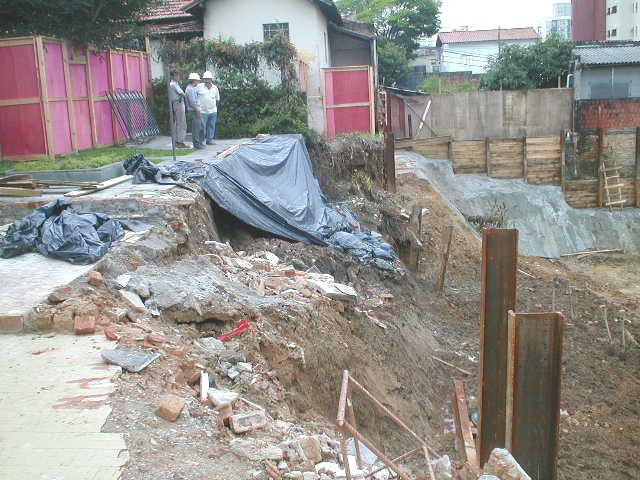 | - Foto em 15/01/03 - Situação da obra quando a construtora contratou a SOLO.NET. Os perfis metálicos da cortina dos fundos entraram em colapso, levando edículas e jardins do vizinho para dentro da obra. | |