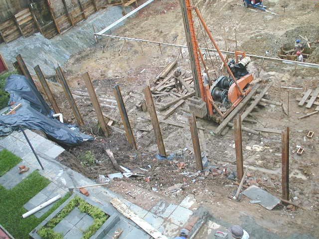 | - Foto em 29/01/03 - Cravação de perfis provisórios para pilares do prédio que tiveram fundação em estacas tipo Franki soterradas. | |