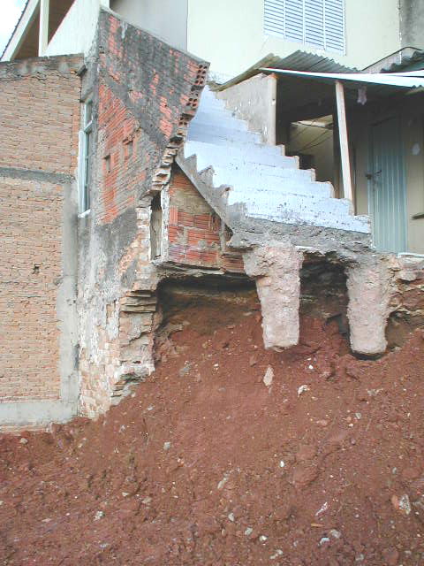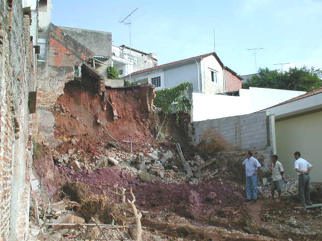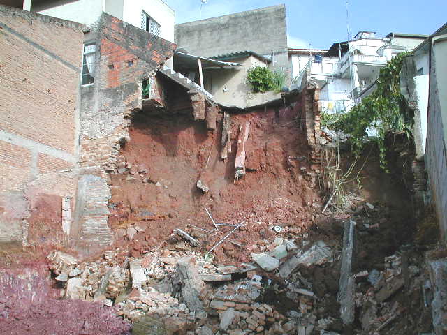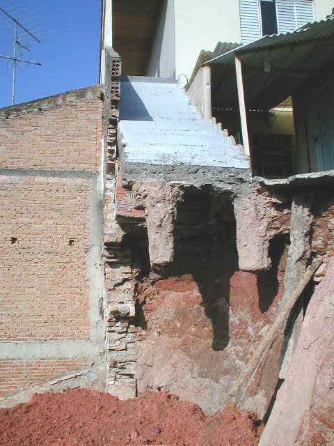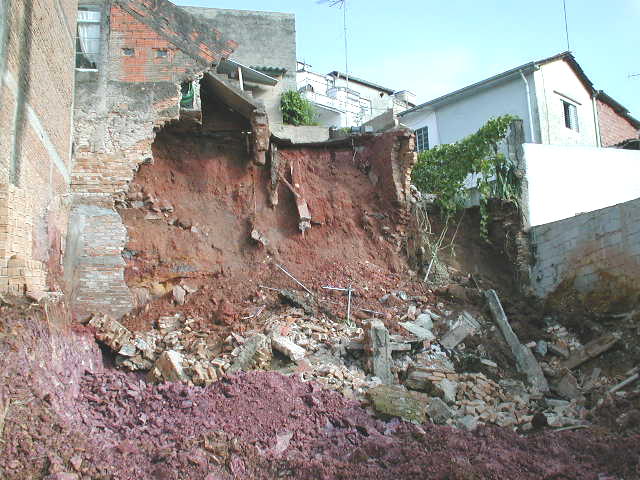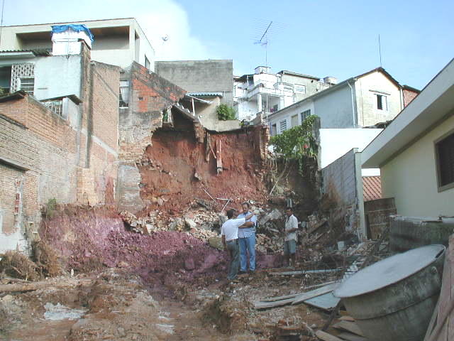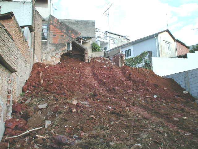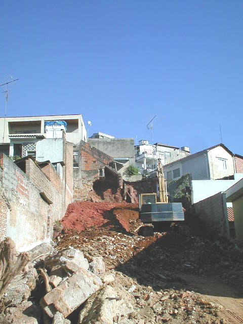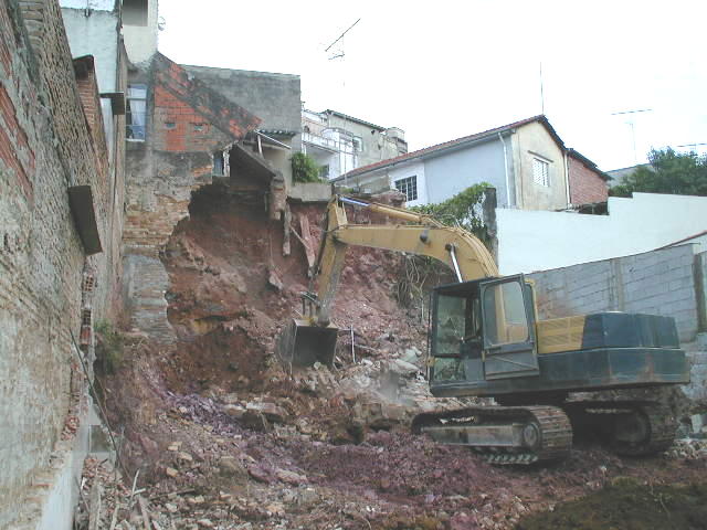 Histórico: Sem o auxílio de um consultor de solos, o proprietário escavou seu terreno em aclive para a construção de um sobrado geminado. Desconsiderando o desnível de quase 10.00m com a residencia dos fundos, prosseguiu com um simples muro de alvenaria como calçamento deste vizinho. Durante o horário de almoço dos funcionários, ocorreu o colapso do "muro", e a casa dos fundos veio abaixo. Não ocorreram vítimas. A SOLO.NET foi contratada apenas para assessorar a estabilidade das construções vizinhas. Procedemos com um reaterro cuidadoso, até a estabilidade destas construções. |