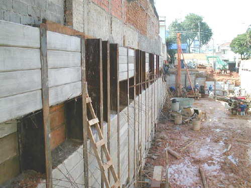 | - Foto em 27/04/04 - Seguindo com ancoragens na cortina pré-moldada. | |