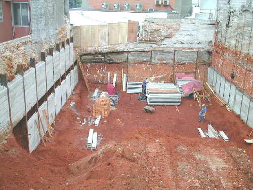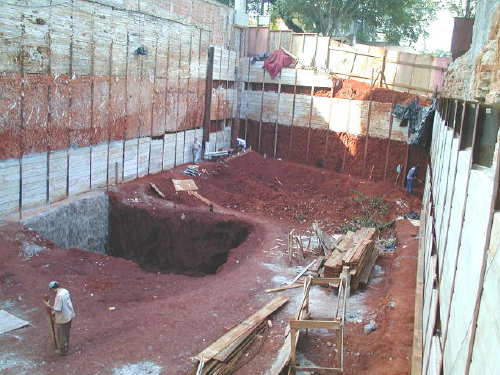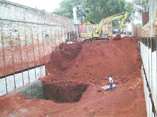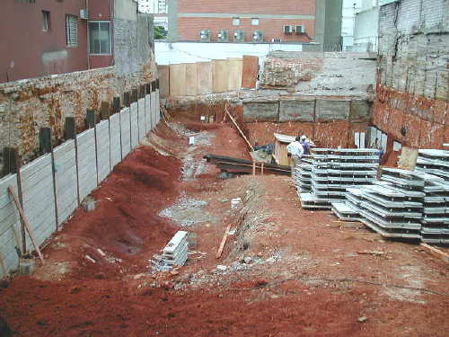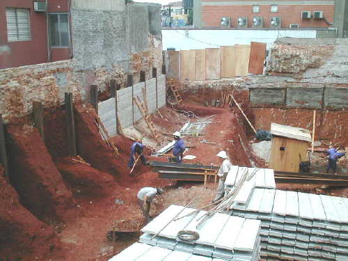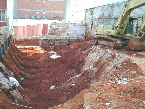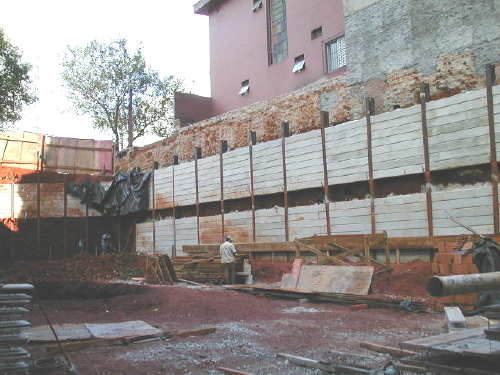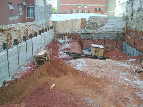 | - Foto em 16/04/03 - Escavação e cortinas em andamento. | |