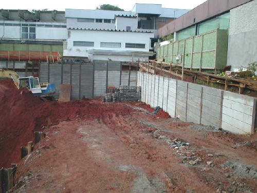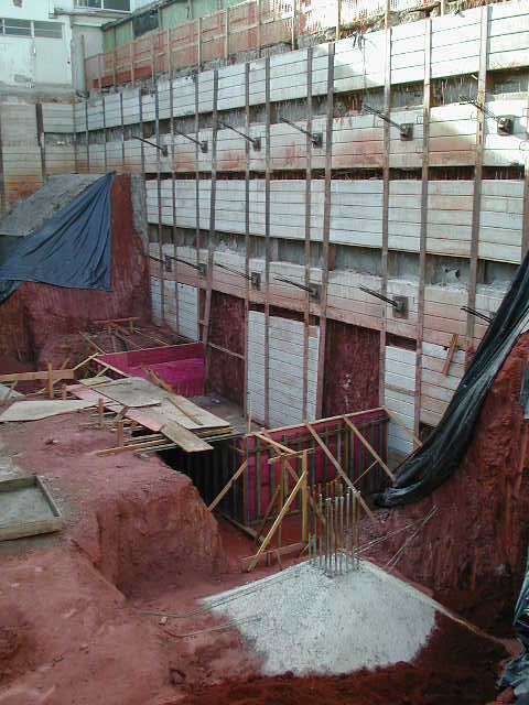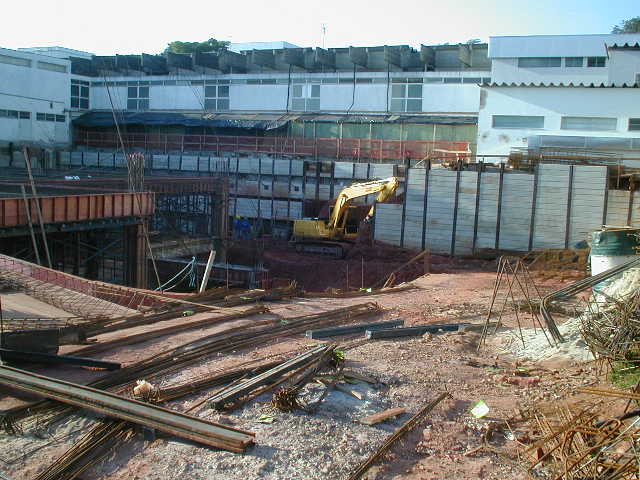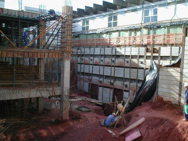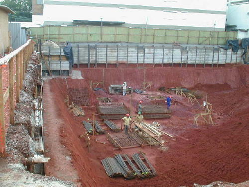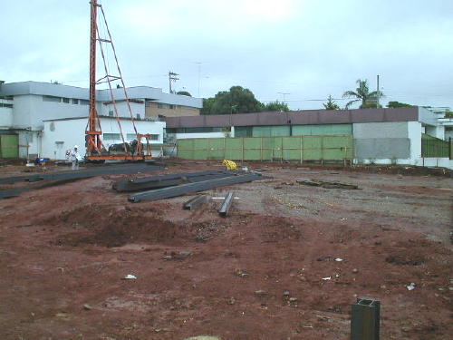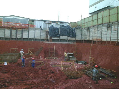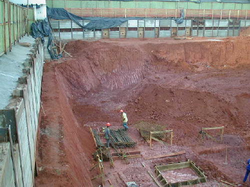 | - Foto em 07/12/06 - Vista da cortina da frente e lateral direita. Iniciando fundação em sapatas. | |