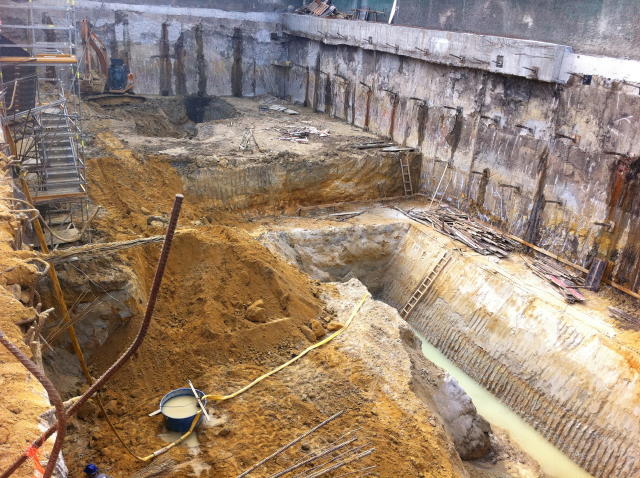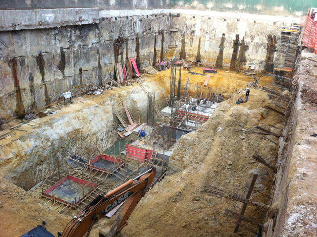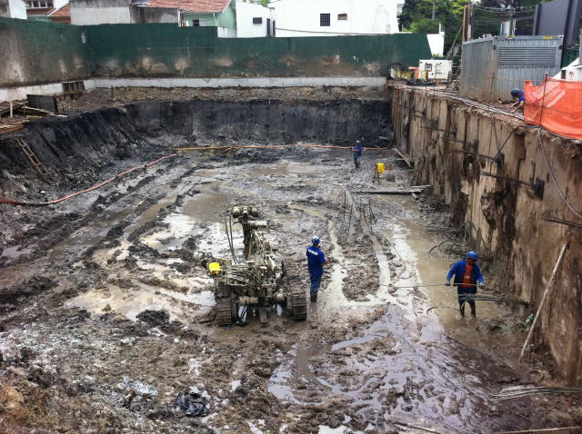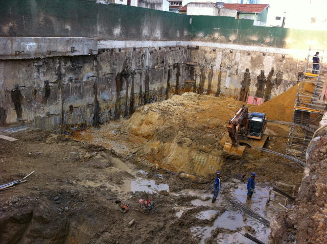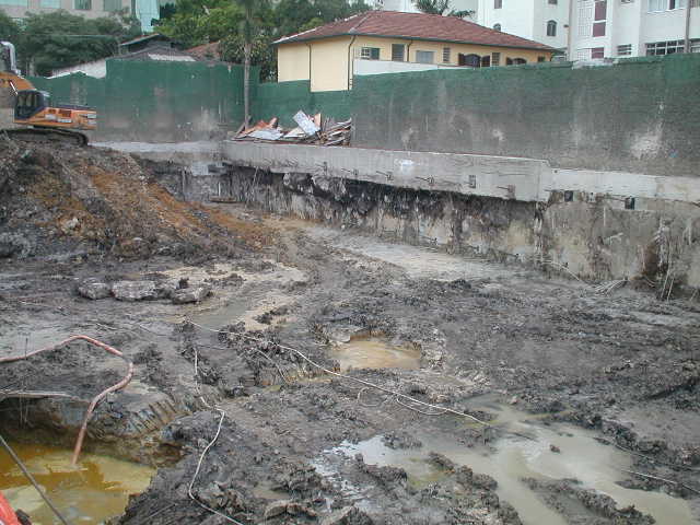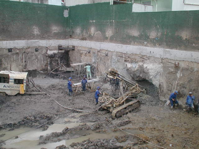 | - Foto em 05/04/11 - Escavação para a 3a.linha de tirantes. | |