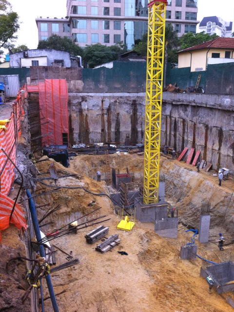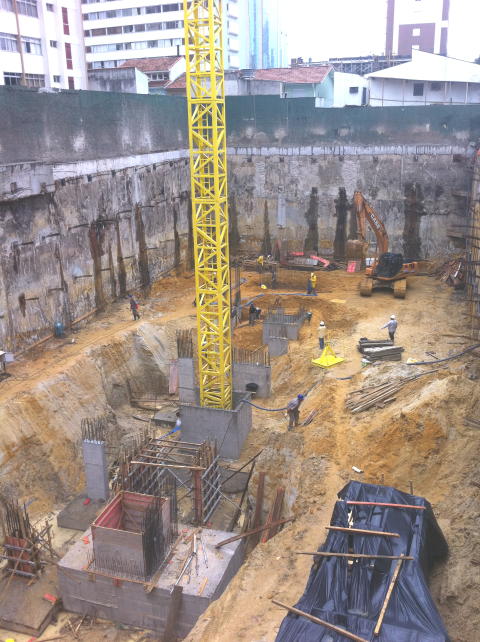 | - Foto em 17/05/11 - Montagem da grua. Reaterro das sapatas do corpo central. | |