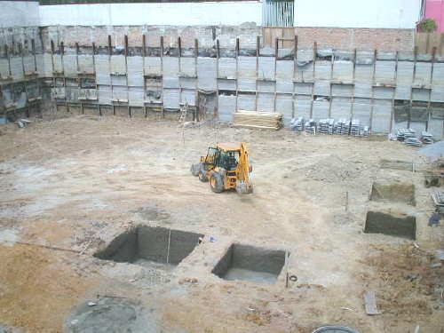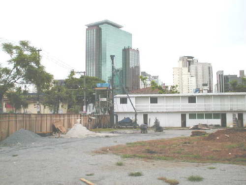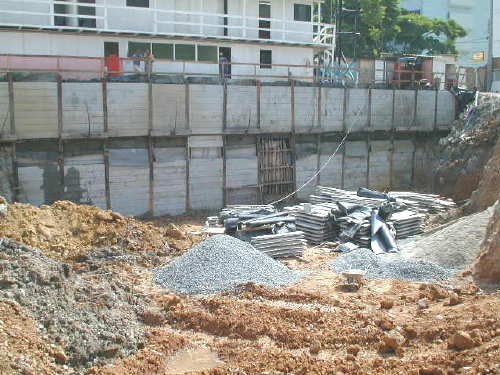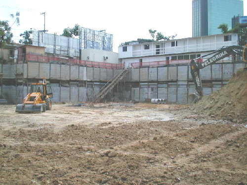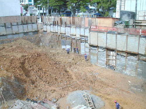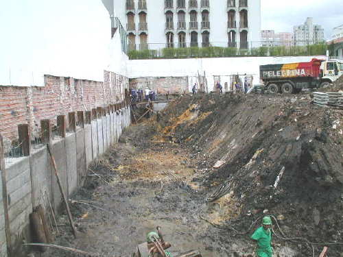| - Foto em 08/04/03 - Escavação e cortinas das laterais chegando ao 2o.Sub-Solo. | |