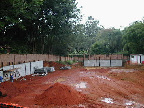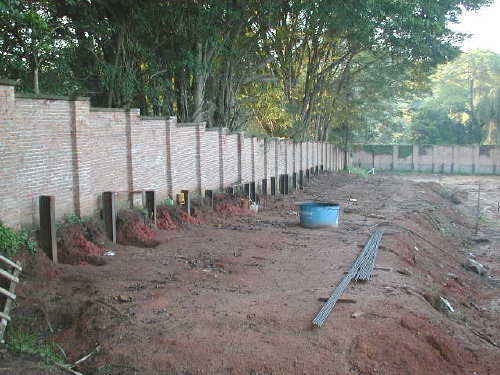 | - Foto em 18/02/05 - Cravados os perfis metálicos na divisa dos fundos. | |