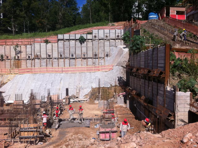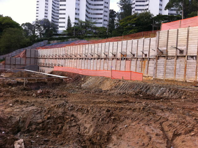 | - Foto em 08/08/11 - Plaqueamento da cortina até a 1a. linha de tirantes | |