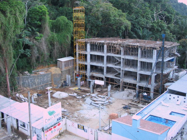 | - Foto em 10/05/07 - Estrutura do Bloco 1 em andamento e cravação das estacas do Bloco 2. | |