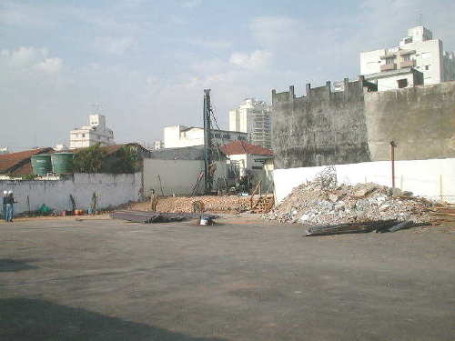 | - Foto em 26/08/04 - Execução de tirantes na lateral direita e prancheamento nos fundos. | |