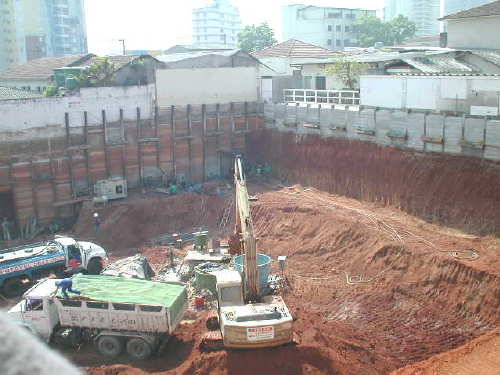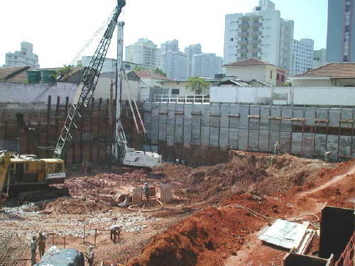 | - Foto em 28/09/04 - Execução das estacas escavadas, e cortina lateral direita do 3o.SS. | |