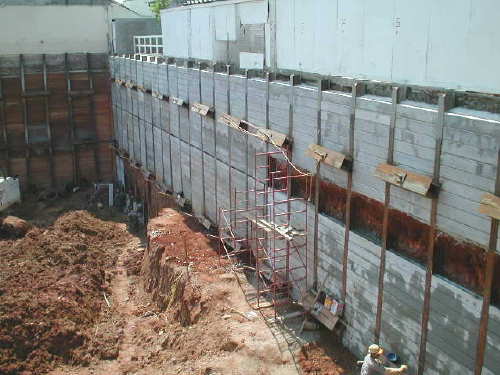 | - Foto em 03/11/04 - Cortina lateral direita e frente. Blocos de fundação concluídos. | |