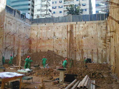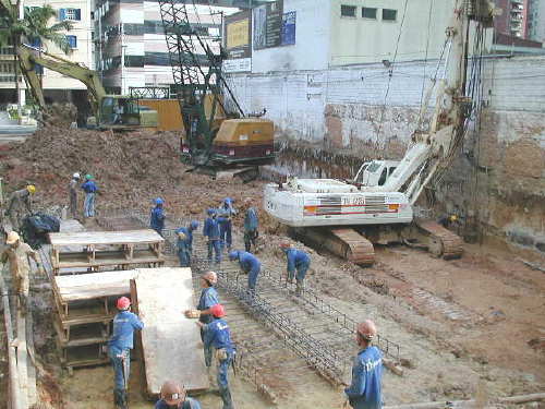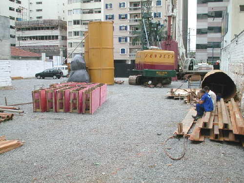 | - Foto em 26/05/04 - Tirantes concluídos. Iniciando fundação em sapatas nos fundos. | |