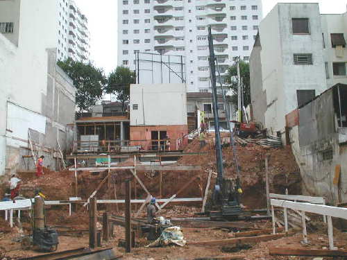 | - Foto em 24/03/03 - Cravação de perfis metálicos na periferia. | |