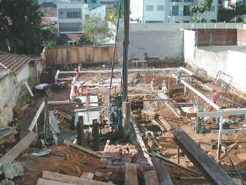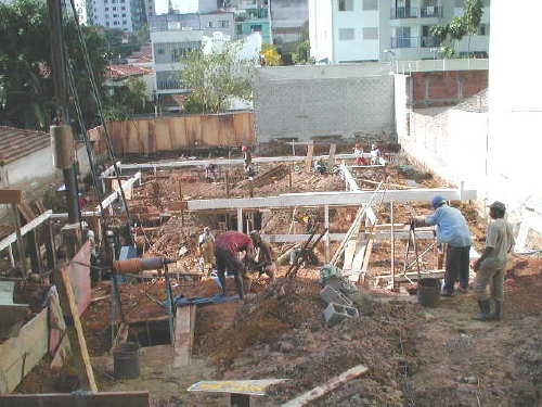 | - Foto em 10/06/03 - Concretando laje do 3o.SS, e cravando estacas da periferia. | |