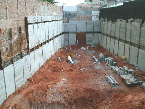 | - Foto em 13/08/02 - Detalhe da cortina lateral direita até o 1o. Sub-Solo. | |
