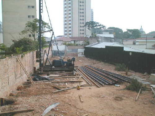 | - Foto em 28/06/02 - Cravando perfis metálicos na lateral esquerda. | |