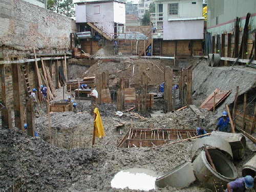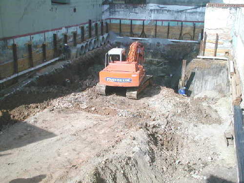 Foto em 14/08/01 - Escavação até o 2o.Sub-Solo, deixando talude provisório na periferia.