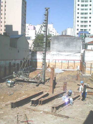 Foto em 31/07/01 - Cravação dos perfis metálicos para o elevador e escada.