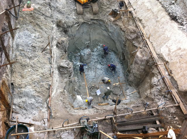 | - Foto em 06/05/2011 - Arrasando estacas e instalando rebaixamento para o elevadores. | |