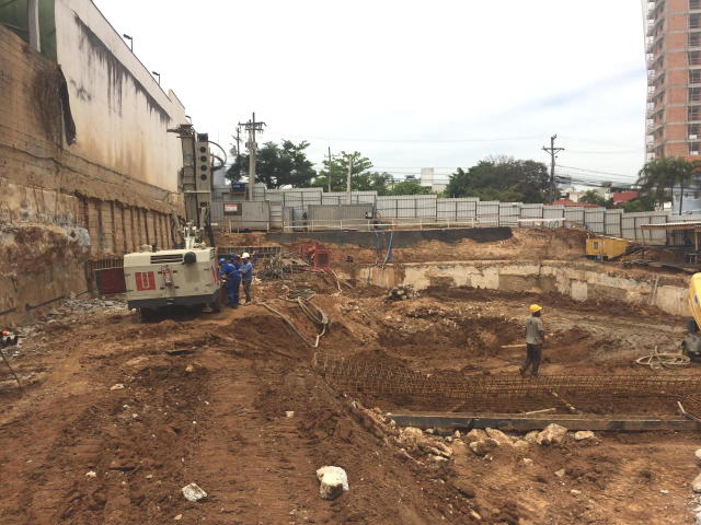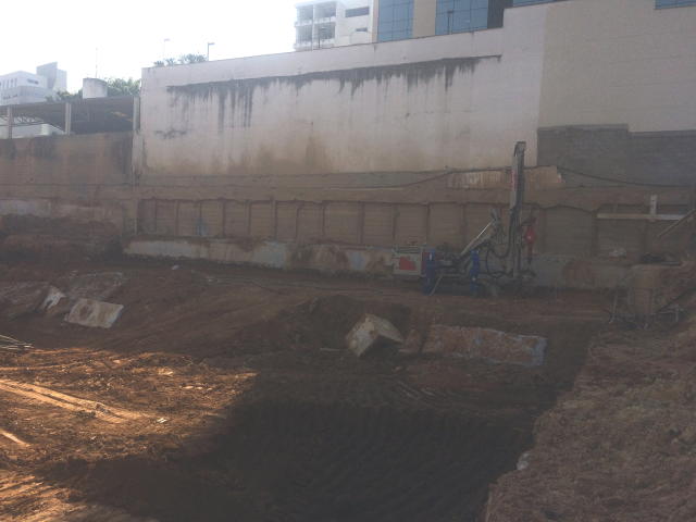 | - Foto em 04/10/2017 - Escavação geral, execução das vigas de coroamento e linhas de ancoragens. | |