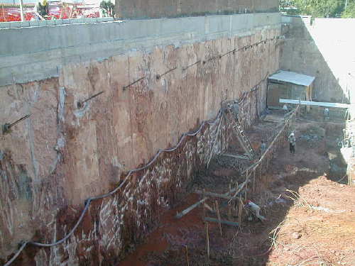| - Foto em 27/05/05 - Protendida a 1a.linha de tirantes e injetando a 2a.linha. | |