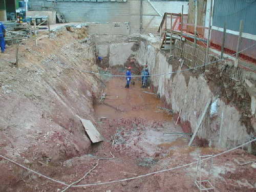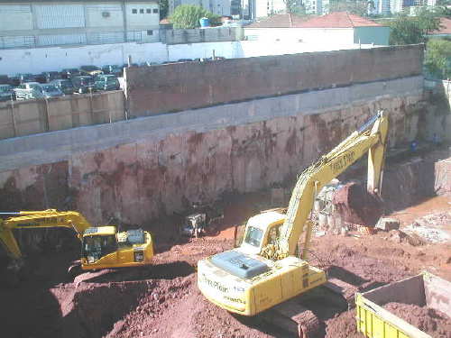 | - Foto em 03/02/05 - Iniciando escavação da parede diafragma na lateral direita. | |