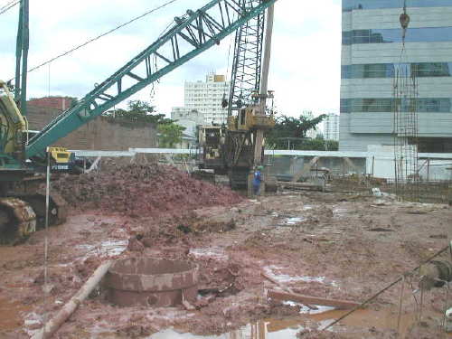 | - Foto em 16/03/05 - Iniciando execução das estacas escavadas, da fundação. | |