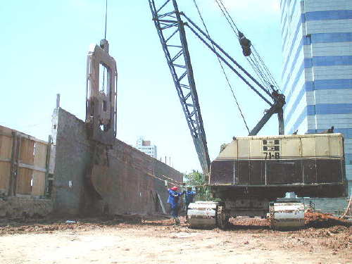 | - Foto em 10/06/05 - Iniciando quebra de estacões para execução dos blocos de fundação. | |