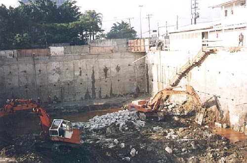 | - Foto em 05/05/00 - Remoção do matacão com o martelete no 3o.Sub-Solo. | |