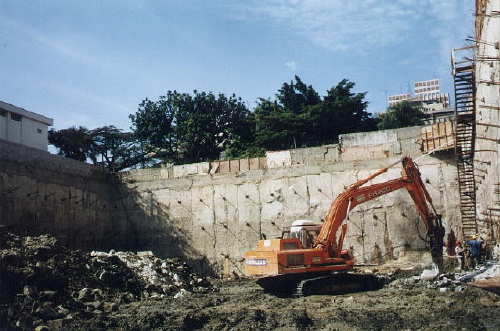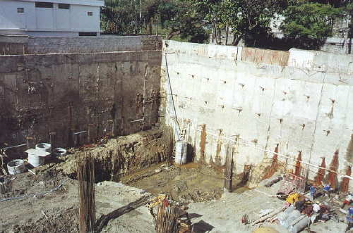 | - Foto em 15/03/00 - Escavação junto a parede diafragma para execução da 3a.linha de tirantes. | |