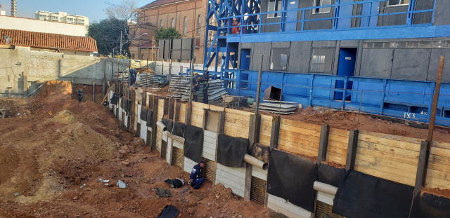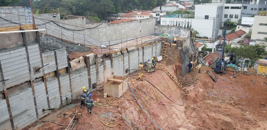 | - Foto em 30/07/2020 - Cortinas de contenção em andamento, 2a.linha de tirantes. | |