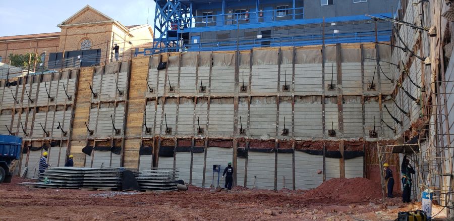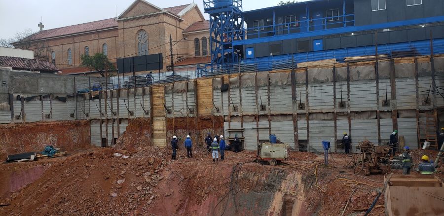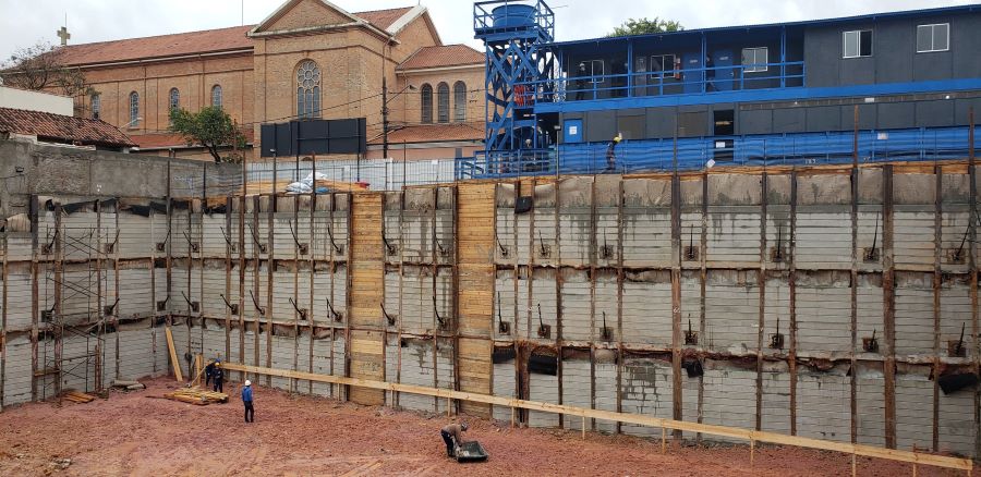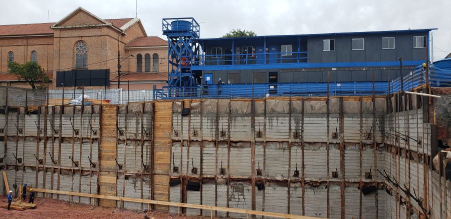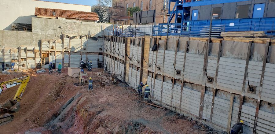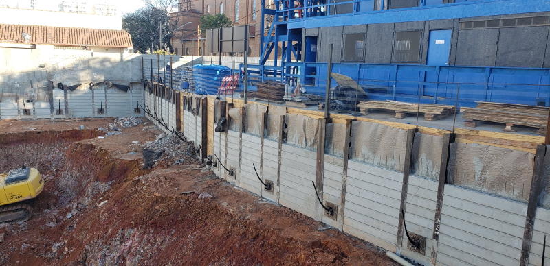 | - Foto em 13/07/2020 - Cortinas do 1o.SS concretadas, e 1a.linha de tirantes em andamento. | |
