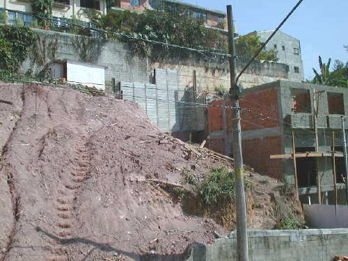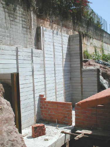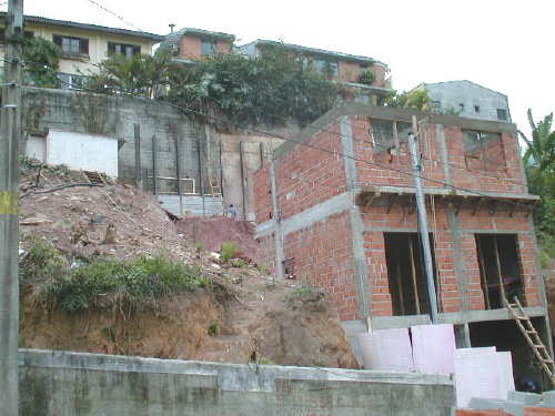 | - Foto em 25/06/03 - Inicio da estrutura da casa, e ao fundo muro de perfis implantados. | |