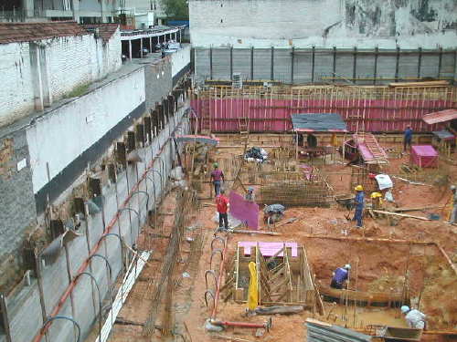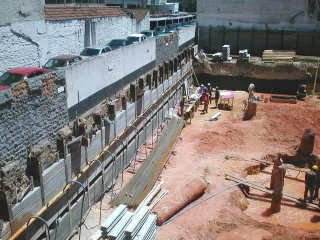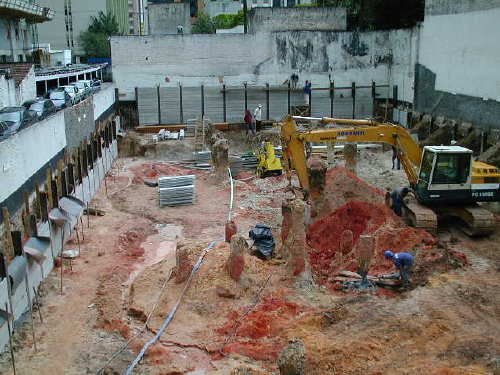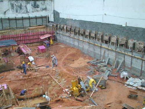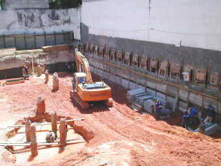 | - Foto em 30/09/04 - Execução parcial da cortina do 1o.SS na lateral esquerda. Escavação parcial até o N.A., e preparando para instalação do sistema de rebaixamento de lençol. | |